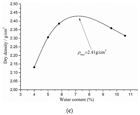 Water content–dry density curves for three different gradations of CGS: (a) S1; (b) S2; and (c) S3.