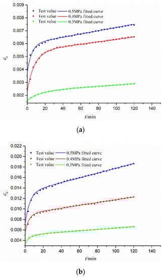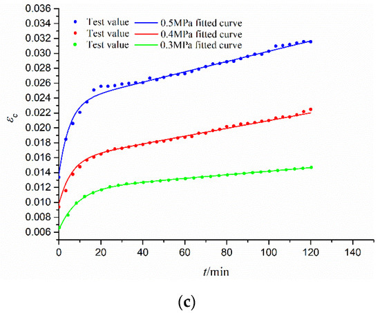Figure 7 shows the tested creep strain data (εc) under different time (t) curves for different constant stress (σc = 0.3 Mpa, 0.4 Mpa, 0.5 Mpa) for the CGS specimens of three different gradations, as well as their fitted curves by the Burgers creep model (Equation (14)). Table 3 lists the fitted Burgers model parameters with high fitting precision (R2 > 0.995). It is seen that all the creep curves have three stages: the instantaneous deformation stage (t = 0), attenuation deformation stage (with decreasing slope), and stable creep deformation stage (with a constant slope). Obviously, for the same gradation of the CGS specimen, εc is increased with the increase in σc. While for the different gradations of the CGS specimen, εc is increased with the decrease in pebble content γ since a smaller γ means more clay content with stronger rheological properties.