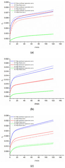 Fitted and nonlinearly regressed creep curves under different stresses for different gradations of CGS: (a) S1; (b) S2; and (c) S3.