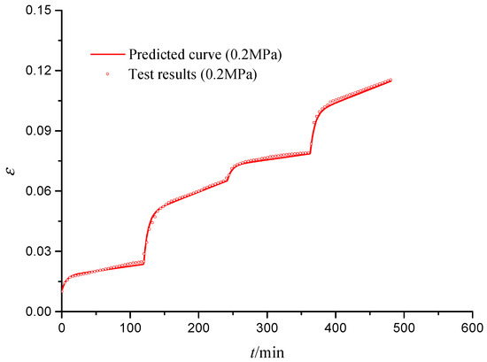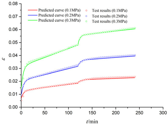 Figure 12 shows the predicted and tested curves of creep–fatigue (C-F) interaction deformation for S1 specimens under different stress levels. It is seen that all creep curves (the first part of C-F interaction) and fatigue curves (the second part of C-F interaction) have three stages: (1) instantaneous deformation stage; (2) attenuation deformation stage; and (3) stable deformation stage. The predicted creep and fatigue curves are close to the tested curves, which can prove the validity of the new creep–fatigue interaction model. The difference between the predicted and tested fatigue curves might be caused by the impact effects of fatigue loads and the discreteness of geotechnical materials.