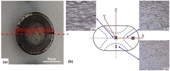 In order to reduce friction, MoS2 and graphite lubricant were coated on the end face of the cylindrical sample. The true strain was calculated as ε = ln(h0/h1), where h0 and h1 are the initial and final height of samples, respectively. At the end of compression tests, the height was reduced by 66.6% by using the true strain of about ε = 1.09. After compression, all the samples were immediately quenched into the water to maintain their deformed microstructure. Each compression test was repeated at least three times with three different samples to ensure the accuracy of the results. Then, the compressed samples were cut along the radial center with a WEDM machine (DK7740B-CG, CQL). The feed speed of molybdenum wire is 0.8 mm/s. The observation position is the geometric center position of the sample, which is more conducive to slip generation and plastic deformation and is an easy deformation zone II, as shown in Figure 1b. Macroscopic photos of the compressed sample and the microstructures in different deformation domains are shown in Figure 1. The cast specimens and compressed samples were mechanically polished with Wuxi brand sandpaper according to the standard procedure, then polished with 0.5 μm diamond grinding paste to make the surfaces of the samples mirror without any scratches. The polished surfaces were etched with a chemically corrosive mixture of picric acid (5.5 g), ethanol (18 mL), water (10 mL), and acetic acid (5 mL), followed by rinsing immediately with ethanol. The microstructures of the samples were observed by optical microscope (OM, Olympus-DSX500).