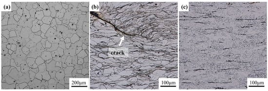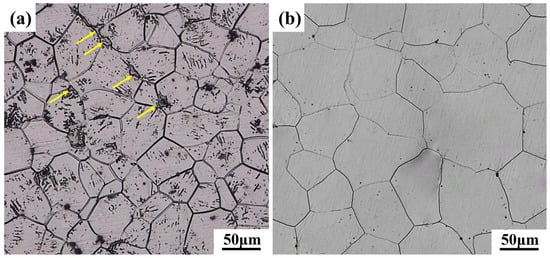 Figure 2 shows the optical microstructure photos of GW94K magnesium alloy. The as-cast alloy was mainly composed of α magnesium matrix, that is, a solid solution of magnesium containing Gd and Y elements, and a coarse eutectic β-phase (Mg24(Gd, Y)5) [,,], in which the eutectic phase was mainly distributed along grain boundaries as shown by yellow arrows in Figure 2a. After solution treatment (T4) at 500 °C for 10 h, the eutectic structure in the as-cast ingot had completely dissolved into the α-magnesium matrix, as shown in Figure 2b. It was observed that the grains were coarsened obviously, with the average grain size being about 108μm.