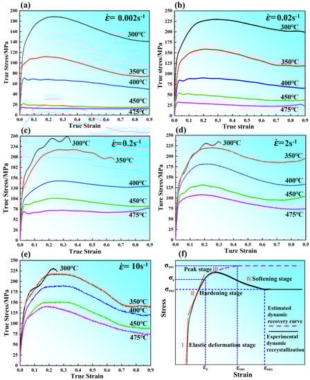 Flow stress curves of the as-solutioned GW94K alloy over the temperature range of 300~475 °C at strain rates of (a) 0.002 s−1, (b) 0.02 s−1, (c) 0.2 s−1, (d) 2 s−1, (e) 10 s−1, (f) schematic presentation of the flow curves for dynamic recovery and dynamic recrystallization.