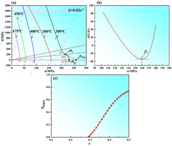 The purpose of evaluating the variations of work hardening rate (θ = dσ/dε) and true stress (σ) of the material is to accurately determine the true stress and corresponding true strain values at the initiation of DRX. The determination of the beginning of DRX is related to the inflection point of strain hardening rate (θ) versus flow stress (σ) curve according to abbas NAJAFIZADEH [] and H. J. McQueen’s [] method. The relationship between the strain hardening rate (θ) and flow stress (σ) with a strain rate of 0.02 s−1 is shown in Figure 4a. The peak stress value (σp) is obtained from the curve at which the strain hardening rate θ is zero (in Figure 4a). The stress σWR is the steady stress of materials during work hardening and dynamic recovery [], which is obtained by the extrapolation of the θ vs. σ. The initiation of the DRX process is expressed by the inflection point (σc) of the curve in Figure 4a and the lowest point (σc) of the curve in Figure 4b. From Figure 4a, the peak stress decreased with the decrease of strain rate and the increase of compression temperature. This is attributed to the relatively low strain rate can provide enough time for DRV and DRX. At elevated temperatures, DRV and DRX occur relatively fully and the softening effect is enhanced. In this Figure, the curves also can be divided into four stages [,]; this is consistent with the results of the analysis in Figure 3f. From the stress–strain curves, the volume fraction of DRX that the specimen is deformed at 0.02 s−1 and 450 °C can be calculated and is shown in Figure 4c. Figure 5 shows the relationship between critical strain (εc), peak strain (εp), and Zener–Hollomon parameters of the Mg–8.7Gd–4.18Y–0.42Zr magnesium alloy. An earlier study [] indicated that the relationship between the critical strain (εc) and the peak strain (εp) was in the range of (0.6~0.85) εp as the critical strain to express the beginning of dynamic recrystallization. The results in Table 2 show that the ratio of critical strain to peak strain ranged from 0.72 to 0.77, with an average value of 0.74.