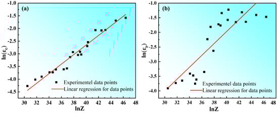 Relationship between critical strain (εc) and Zener–Hollomon parameters (Z-parameter) (a), and correlation between peak strain (εp) and Zener–Hollomon parameters (Z-parameter) (b).