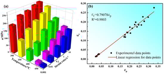 Figure 6a shows the sensitivity of peak stress of Mg-8.7Gd-4.18Y-0.42Zr magnesium alloy to compression temperature and strain rate. Firstly, when the strain rate was constant, the peak stress decreased with the increase of compression temperature. Secondly, the peak stress increased with the increase in strain rate. This was attributed to the thermal activation energy of materials being low at relatively low compression temperature, and dislocations proliferate and entangle with each other, which leads to the decrease of softening effect caused by dynamic recovery and dynamic recrystallization. The fact that a relatively low strain rate will provide enough time for DRV and DRX. Figure 6b shows the relationship between critical strain (εc) and peak strain (εp). It is indicated that εc has a good linear relationship with εp. This is consistent with the earlier studies [,]. Through regression analysis, the empirical equations are obtained as follows: