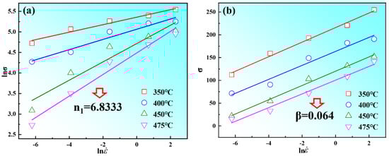 According to Equations (9)–(11), n1 = ∂ln/∂σ, α can be obtained by the ratio of β to n1 (α = β/n1). The stress σ and strain rate are substituted into Equations (9)–(11), and the relationships of ln-ln(sinh(ασ)) ln-ln(σ), ln-σ, are linearly fitted, respectively. From Figure 7, there is a good linear fitting relationship between peak stress σp and strain rate. The values of n1 and β are calculated as 6.833 and 0.064, according to Figure 7a,b. Therefore, the value of α was determined to be 0.0094. In Formula (12), the first item is the average slope (n) of 4.74, as shown in Figure 8a; the second term is the average slope (S) of 5.78, which is determined by the linear fitting of ln[sinh(ασ)]−1/T, as shown in Figure 8b. Therefore, the thermal activation energy of Mg-8.7Gd-4.18Y-0.42Zr alloy can be calculated as 227.67 KJ/mol in this experiment.
