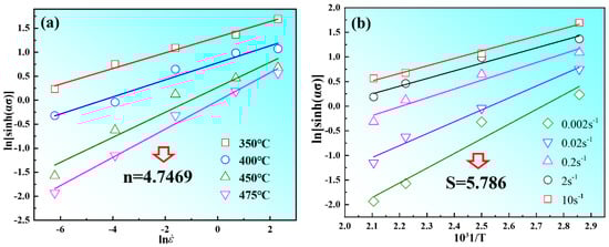 The linear relationship between stress and strain rate: (a) the relationship between ln(sinh(ασ)) and ln; (b) the relationship between ln(sinh(ασ)) and 1/T.