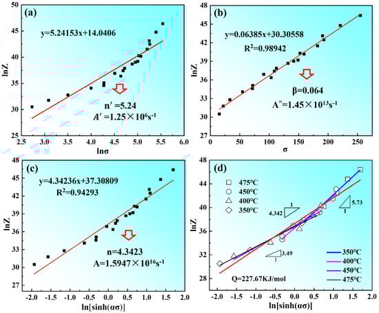 The values of Q and Z parameters under different deformation conditions can be obtained according to Equation (13). The linear relationships of lnZ-lnσ and lnZ-σ are used to calculate the values of n′ and β are 5.24 and 0.064, respectively, according to the slope and intercept of the fitting line, as shown in Figure 9a,b. Thus, the values A′ of and A″ are determined to be 1.25 × 106 and 1.45 × 1013. The linear relationship of lnZ-ln[sinh(ασ)] is used to determine the values of n and A are 4.34 and 1.59 × 1016, respectively, are shown in Figure 9c. When substituting the values of A and n into Equations (3) and (8), the constitutive equation of the as-solutioned Mg-8.7Gd-4.18Y-0.42Zr alloy can be expressed as: