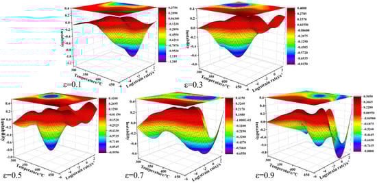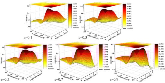 The microscopic deformation mechanism of the alloy under the conditions of deformation temperature and strain rate is elucidated. The power dissipation diagram can reflect the variation of η with temperature and strain rate. The power dissipation efficiency (η) can be calculated and presented by a three-dimensional diagram, as shown in Figure 10. It is found that the relatively dark color represents the region with the highest power dissipation efficiency (η) in the power dissipation diagram. Obviously, there are obvious differences between different strains. Firstly, the power dissipation efficiency (η) is the lowest under the condition of high strain rate and low deformation temperature. Secondly, when the strain rate is low and the deformation temperature is high, the maximum power dissipation efficiency can be obtained, such as the deformation condition of 450 °C/0.002 s−1. Thirdly, the dense contour lines gradually expand to the low temperature and low strain rate region with the increase of strain. It was found that the power dissipation efficiency diagram showed an obvious feature of a relatively dark color at low temperature and a low strain rate when the compression strain was 0.9.