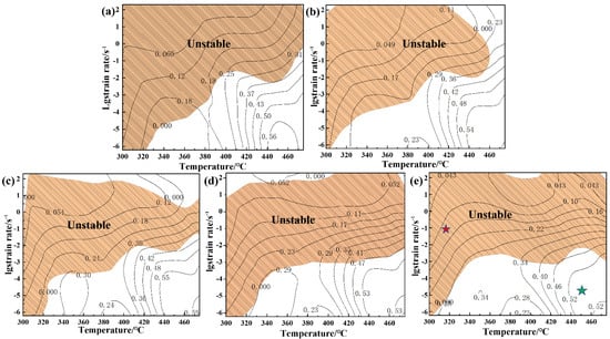 Hot processing map of Mg-8.7Gd-4.18Y-0.42Zr alloy at different strains: (a) 0.1, (b) 0.3, (c) 0.5, (d) 0.7, (e) 0.9.