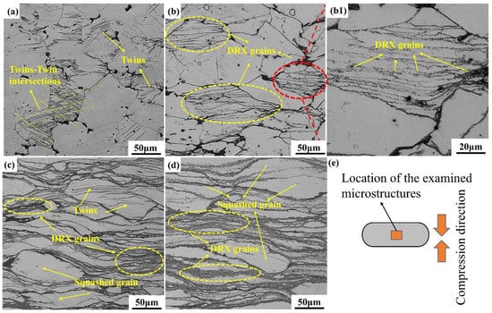 Microstructure of compressed samples with strain rate is 0.02 s−1 at 300 °C: (a) ε = 0.1, (b) ε = 0.3, (c) ε = 0.7, (d) ε = 0.9, (b1) The bigger magnification microstructure of (b), (e) Schematic diagram of the location of the examined microstructures.