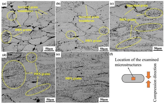 Microstructure of compressed samples with strain rate is 0.02 s−1 at 400 °C: (a) ε = 0.1, (b) ε = 0.3, (c) ε = 0.5, (d) ε = 0.7, (e) ε = 0.9, (f) Schematic diagram of the location of the examined microstructures.