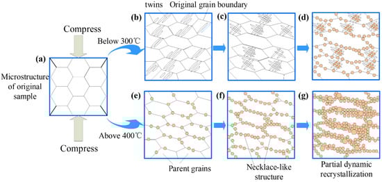 The dynamic recrystallization mechanism of Mg-8.7Gd-4.18Y-0.42Zr magnesium alloy under different deformation conditions is expounded, as shown in Figure 16. The microstructure of the original specimen is composed of equiaxed grains. When the compression temperature is below 300 °C, the microstructure starts with the formation of lenticular twins, as shown in Figure 16b, while the dislocations are also activated []. With the increase of strain, the phenomenon of twin–twin intersections commences appearing, in which DRX grains gradually nucleate and grow up. Then the volume fraction of DRX grains gradually increased and began to expand outward with further increasing strain, while the DRX grains nucleate and grow up along the initial grain boundaries, as shown in Figure 16d. Compared with the compression temperature above 400 °C, DRX grains proceed from nucleating at the original grain boundary at the early deformation stage. Supposing dynamic recrystallization results in grain refinement, the necklace-like typical recrystallized structures are generally observed. With further increase of strain, DRX grains gradually expand inward the original grains shown in Figure 16g. Therefore, When the compression temperature is above 400 °C, DRX grains nucleate preferentially at the original grain boundary, Then gradually expand inward with the increase of strain. Nevertheless, Under the deformation conditions below 300 °C, the DRX grains nucleate preferentially at the twin–twin intersections in the parent grains and gradually expand outward with the increase of strain.