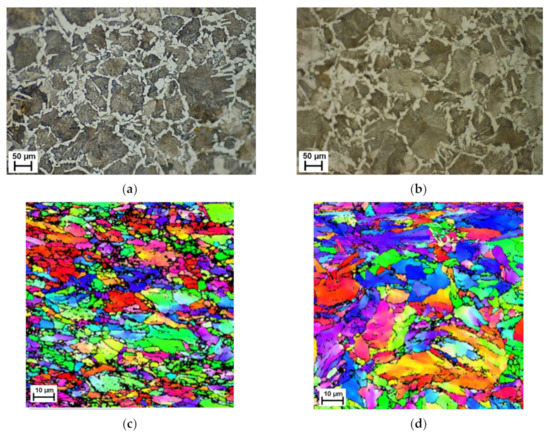 Optical (a,b) and EBSD (c,d) images at room temperature before (a,c) and after (b,d) heat treatment of ferrite/pearlite starting structure specimens.