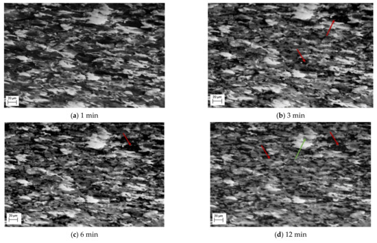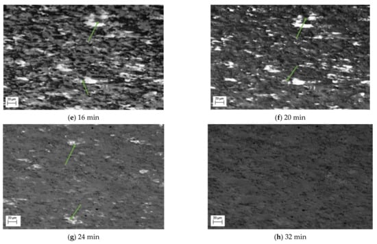 Also observed in this sequence of SE images is the change of the lighter phase into the mid grayscale. However, this change is not observed until after 12 min, Figure 2d. This is then exacerbated, Figure 2e, after 16 min. Unlike the darker phase transformation, which occurs homogenously, the transformation to austenite appears to occur from the edges moving into the centre (heterogeneously)—as can be seen quite clearly in the larger, light grain shown by the green arrow in Figure 2d–f. The smaller lighter areas also begin to shrink quite rapidly and after 24 min (Figure 2g), these have almost all transformed. It is worth noting that Figure 2g also experiences some uncorrected beam drift and the green arrow highlights where the original large light grain is in the new position. It can be seen that this continues to shrink and by 32 min, there has been a complete transformation (Figure 2h). Noting the differences in the two-phase transformations, Figure 3 shows a focused transformation over the first 30 min of the specific dark phase cluster and Figure 4 presents a specific light phase cluster.