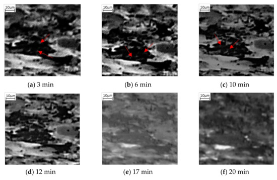 Phase transformation of a darker grain into the mid grayscale form via nucleation in (a–c) followed by growth (d,e) and complete transformation (f). The red arrows show initial lighter grey spots forming within the dark phase, increasing in numbers from 3 min after heating (a) through to 10 min of heating (c).