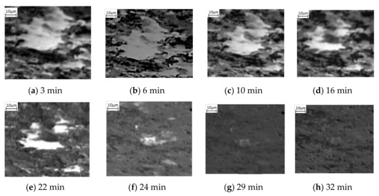 In situ SEM imaging during the heat treatment enabled the documentation of the ferrite/pearlite to austenite phase change using both SE and EBSD imaging. Figure 2 shows a selection of SE images captured during the first 30 min of the heat treatment process. A significant variation in grayscale between images is observed, which is widely accepted to indicate the existence of different phases simultaneously in an SE image [12]; assuming no adjustment to the brightness or contrast was made between images. Therefore, the SE images presented in Figure 2 show the stages of the phase transition from a microstructural perspective. Figure 2a shows an SE image of the carbon steel surface once the required heat treatment temperature of 800 °C was reached. Here, an outline of the grain boundaries can be seen owing to the phenomenon of thermal etching. The outline also facilitates identification of individual grain’s phase presence, although this localised phenomenon is further investigated using EBSD high temperature imaging. Instead, the SE images can be used to examine the changing ratio of the three different grayscale levels corresponding to the phases, as the transformation of ferrite/pearlite to austenite occurs in real time.