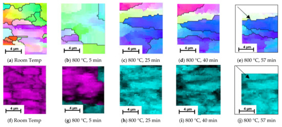 Grain evolution was also captured using EBSD scans, Figure 6, facilitating a localised understanding of the microstructural evolution during the phase transformation from ferrite/pearlite to austenite; all EBSD scans are taken in the same position unless stated otherwise. Figure 6a,b show there is a significant transformation in the orientation and size of the grains during the initial stages of heating from room temperature to 800 °C. There is also a change in phase, during which the small grains appear to transform prior to the larger ones. Examining the structure after 25 min, Figure 6c, shows a further change in orientation and complete phase change, indicating that the transformation process is complete; a similar timeline to the observations in the SE images presented in Figure 6. EBSD images of the same area at 40 min, Figure 6d, shows no change in phase and minimal growth of grains. The EBSD image taken after 57 min of heating, Figure 6e, shows some beam drift (see the black arrow for direction), but provides enough of the localised microstructure to suggest there is little further evolution.