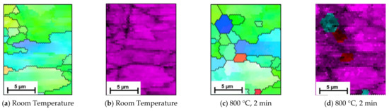 Owing to the speed of the phase transformation, as seen in the EBSD images, the observation of the phase transformation using EBSD is limited to the first three scans in Figure 6. However, additional EBSD scans at this temperature, shown in Figure 7, further support the SE data. The scans indicate that as well as smaller grains transforming first, some initial nucleation of austenite grains occur within the ferrite/pearlite formation, and this is where transformation first occurs. Figure 7 depicts an initial room temperature scan (Figure 7a,b) and then a smaller scan in the same position after just 2 min of heating at 800 °C (Figure 7c,d). Where smaller grains have formed, the phase scan in Figure 7d indicates that these areas are austenitic (indicated by the blue) or alternatively concentrated areas of carbon (indicated by the red). The findings in Figure 7a, show an initial austenite nucleation between the pearlite grains; represented as a small agglomeration of ferrite grains on the right hand side of the image. Previous, rapid heat treatment followed by quenched cooling EBSD studies have indicated that at temperatures of 700–800 °C austenite nucleates preferentially as a block at triple junction at high angled grain boundaries [9]. The inverse pole figure data presented in Figure 5 also indicates this, where austenite is shown to occur in, and subsequently appears to undergo complete transformation of, these high angled grains first before transforming the lower angled grains. However, due to the similarities between pearlite and ferrite it is often difficult to disseminate the two phases using EBSD, hence the benefit of SE imaging to support these findings [13].