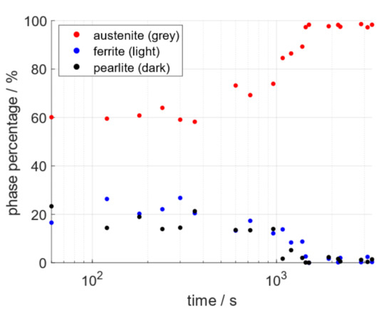 The SE images were taken at sufficient frequency to facilitate the quantifiable tracking of the ferrite/pearlite to austenite phase change in situ. Percentages of the three phases quantified using ImageJ’s histogram segmentation tools were plotted against time. The combined results of three separate data sets are presented in Figure 8, on a log-linear graph, as is standard practice for phase transformations [4]. The graph demonstrates that the extreme grayscale ends (light and dark) representing ferrite and pearlite respectively decrease as the austenite phase increases and the graphs form a sigmoidal shape.