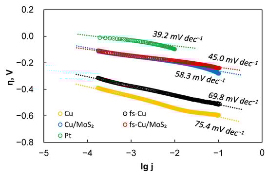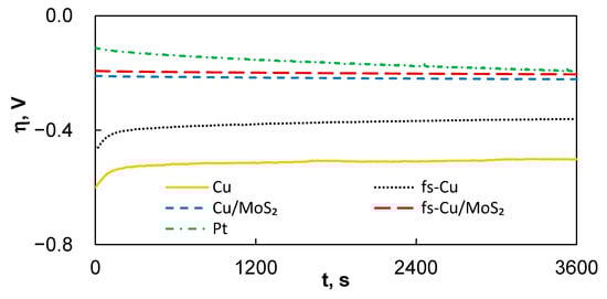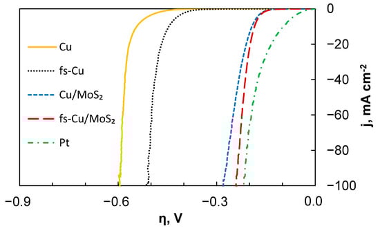 Levinas, R.; Grigucevičienė, A.; Kubilius, T.; Matijošius, A.; Tamašauskaitė-Tamašiūnaitė, L.; Cesiulis, H.; Norkus, E. Femtosecond Laser-Ablated Copper Surface as a Substrate for a MoS2-Based Hydrogen Evolution Reaction Electrocatalyst. Materials 2022, 15, 3926. https://doi.org/10.3390/ma15113926