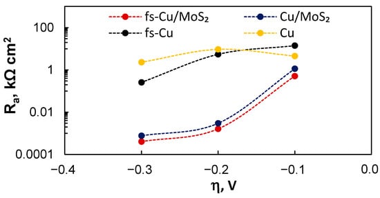 | η, V | Cdl, mF cm−2 | Rct, Ω cm2 | Ca, mF cm−2 | Ra, kΩ cm2 |