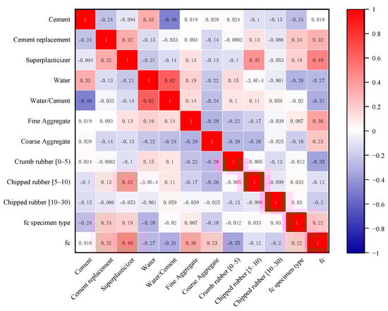 In summary, a database of 307 sets of experimental data has been developed in this paper, where the data were derived from the published literature [,,,,,,,,,,,,,,,,,,,,,,,,,,,,,,,,,]. The database was divided into two parts, of which 277 groups were used for training and the remaining 30 groups were used for testing. Eleven input variables were used in this paper; these include cement content, water content, water–cement ratio, cement replacement material content, coarse aggregate content, fine aggregate content, crumb rubber content, flake rubber content, admixture addition, and specimen shape. The output variable was the compressive strength of the rubber concrete at 28 days. The statistical analysis of the input and output variables of the database is shown in Table 1. It is important to note that the interdependency of the model is an important parameter as it can lead to poor performance of the model []. The various parameters used as inputs can be interdependent, and such problems are known as “multicollinearity problems” []. It has been suggested in the literature that to develop an accurate model, the correlation between the two input parameters should be less than 0.8 []. A heat map of the correlation coefficients of the input and output variables in this study is shown in Figure 1. Table 2 shows that the correlation coefficients between the parameters are all less than 0.8, thus reducing the effect of multiple collinearities.