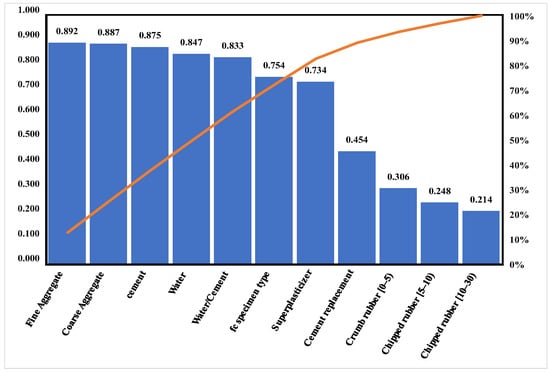 where denotes the input parameter; denotes the output parameter; n indicates the number of data; means the strength of the relationship. The values of between the strength of the rubber concrete and the input parameters are shown in Figure 2. As can be seen from the graph, the most significant influence on the strength of the rubber concrete is the fine aggregate, followed by the coarse aggregate, while the smallest impact is on the largest particle size of the rubber sheet.