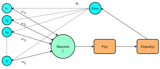 In Figure 3, represents input variables, represents the connection weight. The expressions of s and neural network output y are shown in Equations (2) and (3) [].
