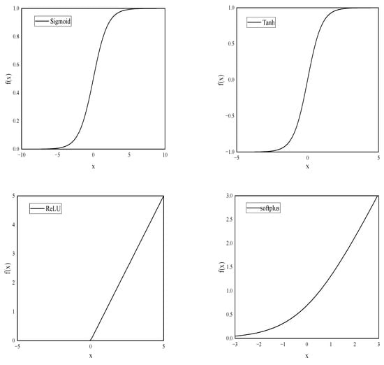 where b is the bias, and d is the sum of weights and biases. The role of the bias is to increase or decrease the influence of the activation function. F denotes the activation function, which allows the neural network to approximate any nonlinear function and thus can be applied to a wide range of nonlinear models. There are various activation functions for neural networks, among which the commonly used transfer functions are sigmoid, softplus, tanh, and ReLU. An image of a commonly used activation function is shown in Figure 4.