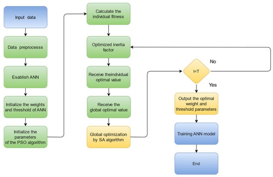 The SA algorithm was introduced into the adaptive particle swarm optimization algorithm because the PSO algorithm is prone to local extremes late in the iteration, while the global search capability of the SA algorithm is stronger and can effectively compensate for the shortcomings of the PSO algorithm. The workflow of the ASAPSO-ANN model developed in this study is shown in Figure 5.