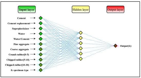 The ANN is one of the most used machine learning techniques for predicting the compressive strength of concrete. ANN can be thought of as a data processing operation or as a black box that produces the appropriate output based on the input data []. A backpropagation network is the most commonly used network structure and it adjusts weights and biases by backpropagation of errors, eventually reducing the errors to an acceptable state []. A backpropagation neural network is composed of an input layer, a hidden layer, and an output layer. In addition to the input layer, the neurons of the hidden layer and output layer are composed of weights, biases, and activation functions. The structure of the backpropagation neural network is shown in Figure 3.