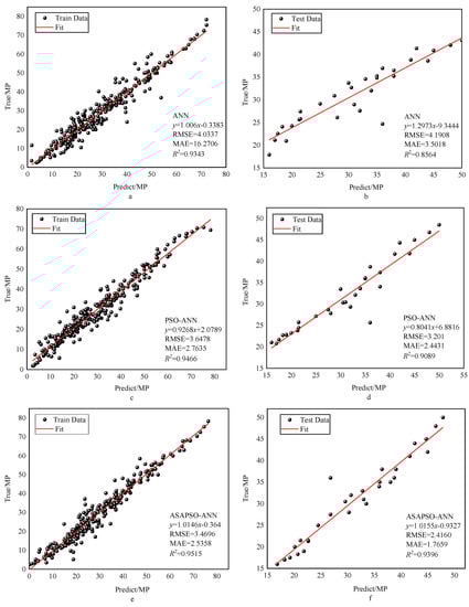 Comparison of actual and predicted values for the three models: (a,b) for ANN model; (c,d) for PSO-ANN model; (e,f) for ASAPSO-ANN model, for training and testing phases, respectively.