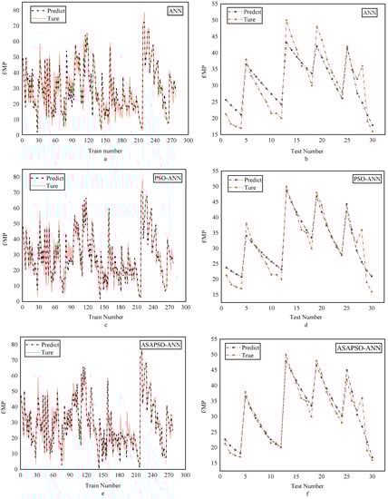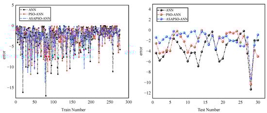 The regression analysis for the three models are presented in Figure 7. Panels a, c, and e denote training set results, and b, d, and f denote testing set results. The figure shows that most of the data points in the training set of the three models were distributed on both sides of the fitted line and the were good. This indicates that all three neural network models had a good fitting ability. Among these, the ASAPSO-ANN model had the highest , which is the indication of a stronger fitting ability. The results from Figure 7b,d,f showed a significant increase in in the testing set compared to the training set, which increased from 0.8564 for the ANN model to 0.9396 for the ASAPSO-ANN model. Meanwhile, the ASAPSO-ANN model had the lowest error in each. Since the testing set did not participate in the training of the model, it could be shown that the ANN model with the introduction of the ASAP SO algorithm had a substantial improvement in predictive ability. This conclusion could also be drawn from Figure 8 and Figure 9. As can be seen in Figure 8f and Figure 9, the predicted value of the ASAPSO-ANN model was closer to the actual value compared to the ANN and PSO-ANN models. The error analysis for the three models is shown in Figure 10.