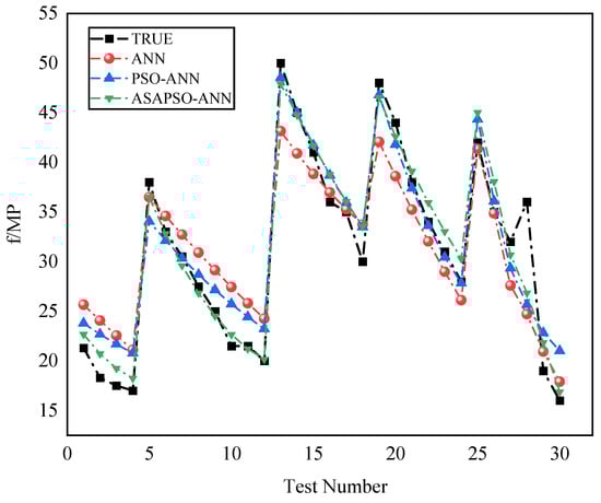 This study focused on the prediction of the compressive strength of rubber concrete using a neural network optimized by the ASAPSO algorithm. Since a single optimization algorithm has its shortcomings, it was necessary to mix the algorithms to compensate for their shortcomings between them. In the previous section, the results of the three models ANN, PSO-ANN, and ASAPSO-ANN are presented in Table 4, but it was necessary to discuss the results from a more intuitive point of view.
