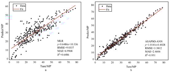 Results of regression analysis of two models: (a) for MRL and (b) for ASAPSO-ANN.