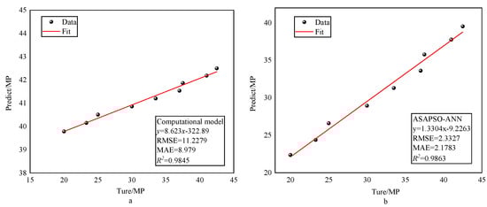 To further validate the reliability of the proposed model, the traditional multiple linear regression model was introduced here []. The multiple linear regression (MLR) model was similar to the neural network model in that both studied the effects of multiple variables; therefore, the two models could be used for comparison. The results of the regression analysis of the two models are shown in Figure 11. A comparison of the indicators is shown in Table 5. As can be seen from Figure 11 and Table 5, the ASAPSO-ANN model outperforms the MLR model. Comparison with empirical formulae was also necessary. M. Reda Taha modeled the empirical formula using polynomials []. Since the empirical formula only used the percentage of rubber content as an input variable, the input variable for the ASAPSO-ANN model was also changed to the percentage of rubber content. To avoid complex calculations, a randomly selected cited study [] was used for calculations using both models. Figure 12 shows the results of the regression analysis for both models. A comparison of the indicators is shown in Table 6. From Figure 12a, it can be seen that the empirical equation model had a high , but its horizontal and vertical values were very different. This indicates that there was a large error between the predicted and actual values. This is also reflected in the other indicator values in Table 6. This indicates the poor predictive ability of the empirical formula model. In contrast, the ASAPSO-ANN model represented in Figure 12b did not suffer from such problems and could predict the strength values of the concrete with accuracy. For these types of empirical formulas, the influence of multiple factors on strength was usually not taken into account, and therefore the ASAPSO-ANN model had a wider application capability than the empirical formulas. Comparison of other neural network models were also necessary. The comparison results are shown in Table 7. As can be seen from Table 6, ASAPSO-ANN performed better than the conventional ANN model when faced with large datasets. Therefore, the proposed model is feasible for strength studies of rubber concrete.