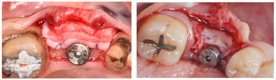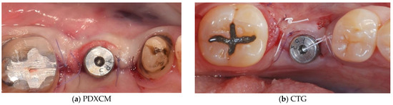 Papi et al. [27] documented a PKMW mean increase of 6.51 and 5.67 mm at 5 months and at 1-year post-surgery, respectively. At the last follow-up control (12 months) a mean shrinkage of 29% was observed. In another prospective study the same authors performed soft tissue peri-implant augmentation combining the use of PDXMs with synthetic bone [43]. Both PKMW and PST showed an increase from pre-surgery to the first month, a decrease during the first 12 months, and a stabilization from 12 to 24 months. Compared to the baseline, after 24 months PST and PKMW gained 1.94 ± 0.05 mm and 1.60 ± 0.11 mm, respectively. Similar results on PST increase have been reported also by Zafiropoulous et al. [38], who using PDXCMs in 27 patients and found at 6 months after surgery a significant increase of 1.06 mm. Stefanini et al. [39] in 10 patients used a coronal advanced flap surgical technique combined with PDXCMs obtaining at 1-year post-surgery 1.2 ± 0.18 mm gain of PST. Papi & Pompa. [40], using digital linear and volumetric measurements reported in 12 patients treated with PDXCMs a volumetric gain in PST of 51,501 mm3 with a mean shrinkage of 23.31%. Comparative clinical data between CTGs and PDXCMs in peri-implant plastic surgery with a 3D analysis have been reported also by Schmitt et al. [41]. Authors at 6 months post-surgery found a mean volume gain of 19.56 ± 8.95 mm3 and 61.75 ± 52.69 mm3 for PDXCM and CTG, respectively, and a mean increase of PST of 0.30 ± 0.16 mm for PDXCM versus 0.80 ± 0.61 mm for CTG. Aragoneses et al. [42] evaluated in female white pigs (Sus scrofa domestica) the clinical and histological differences in peri-implant soft tissue volume augmentation using PDXCM vs. CTG. Three months post-surgery the mean volume increase was 1.53 mm, and it decreased 6 months later of 0.51 mm due to shrinkage and PDXCM resorption. At 45 days, the biopsies corresponding to PDXCMs documented a complete epithelial healing with the presence of a well keratinized layer. At 90 days all sites treated with PDXCM showed a matured keratinized squamous stratified epithelium sustained by a connective tissue with correctly organized collagen fibers and normal vascularization. However, at 90 days post-surgery, sites treated with CTG, compared to those treated with PDXCM, showed a statistically significant higher thickness (approximately 60%). The variability of the results reported by the over mentioned studies might depend by the different surgical techniques and materials used [44,45,46]. The use of a surgical bilaminar technique with the PDXCM placement under a split-thickness buccal flap could favor the blood perfusion of the matrix, which has been described as one of the factors affecting the result. Other factors influencing clinical outcomes might be also connected to the different suturing techniques and materials (i.e., the needle’s characteristics, bite size, suture position, location of knots tied, etc.), and early suture removal (<10 days). Another important consideration is that commercially available PDXCMs have a standard thick, while after the withdrawal, CTG can be prepared to the desired thickness. To overcome some of the above-mentioned limitations (Table 6) authors of the current paper present preliminary results of a RCT in which a new inlay technique named Guided Soft Tissue Regeneration (GSTR) performed using a new PDXCM (NovoMatrixTM; BioHorizons, Birmingham, AL, USA) has been compared to CTG. In Figure 1a, Figure 2a, Figure 3, Figure 4a, Figure 5a and Figure 6a is presented a clinical case treated with PDXCM and GSTR technique. In Figure 1b, Figure 2b, Figure 4b, Figure 5b and Figure 6b is presented a clinical case treated with CTG.
