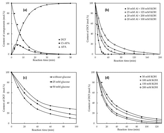 We observed earlier [27] that the HDC mechanism (HDC based on in situ produced Raney Ni) works in the case of HDC of several chlorinated anilines. In this case, the positive role of glucose as an additive was documented, which influences the formation of Raney Ni nanoparticles from used Al-Ni and enables effective HDH. For verification of this reaction pathway, glucose was added in different quantities to the mixture of DCF dissolved in diluted KOH solution before the addition of Raney Al-Ni. Unfortunately, however, for DCF, we observed that the addition of glucose to the reaction mixture only causes a decrease in the HDC rate (see Figure 1c). The attempts to decrease the required quantity of Al-Ni by the addition of glucose acting as a promoter of highly reactive Ni0 nanoparticles formation (as we published earlier [37] were not successful. This fact could indicate the possible HDC mechanism of DCF, which is based not on a reaction with the activated hydrogen adsorbed on (nano)nickel surface, as was assumed for HDC of 3-chloroaniline [32], but was in all probability caused by the nickel catalyzed reductive action of aluminum in alkali after adsorption of DCF on the surface of the Al-Ni alloy composing local galvanic couples between active Al anode and Ni cathode (Ni catalyzed dissolving-metal reduction) [30].