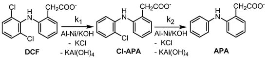 Possible mechanisms of the described HDH comprise either (a) in situ generations of hydrogen by the dissolution of Al from Ni2Al3 or 38% NiAl3 crystalline phases occurring in Al-Ni alloy and formation of the catalytically active Raney nickel saturated with produced H2 as the active HDH agent or (b) direct HDH of DCF adsorbed on Al-Ni alloy acting as a galvanic couple, which hydrodehalogenates DCF during oxidation and dissolution of Al. The dissolution of Al enables denudation of the active Al-Ni surface for further HDH process [30].
