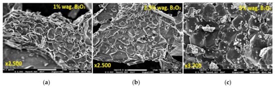 SEM images of CYMSSG: 2.5%Ce MPs, prepared using different amounts of B2O3 flux agent: (a) 1 wt.%, (b) 2.5 wt.%, and (c) 5 wt.%.