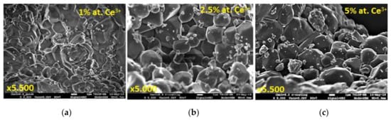 SEM images of CYMSSG:Ce MPs synthesized with an activator concentration in the 1–5% range are shown in Figure 2. Generally, garnet grains are visible in all samples. However, the strong grain agglomeration is observed for samples with the lowest Ce3+ content of 1%. Furthermore, the quantity of agglomerates is significantly lower in the samples with Ce3+ contents of 2.5 and 5 at.%, especially in the last one (Figure 2c). For the last sample, the most uniform distributions of the grain are observed, with their average size in the 3–5 μm range.