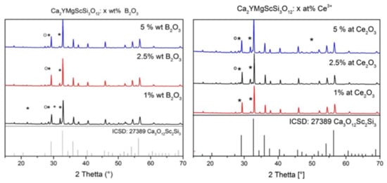 The X-ray diffraction (XRD) of MP samples sintered with different B2O3 flux amounts (Figure 3a) and different Ce3+ concentrations shows almost pure phases of Ca3Sc2Si3O12 garnet (CSSG) in both cases and excellent correspondence with the respective ICSD-27389 pattern. However, some minor amounts of unreacted starting materials, (SiO2) as well as the secondary phases (Ca2Ce8O26Si6, YBO3), are also observed in the XRD patterns (Figure 3).