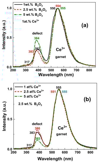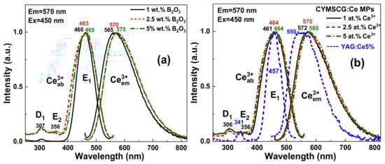 The PL spectra of the CYMSSG:Ce (1 at.%) MPs (Figure 5a) sintered with different B2O3 flux amounts show wide bands peaked in the 565–575 nm range, which corresponds to the Ce3+ radiation transitions from the lowest 5d1 level of the excited state to the 4f(2F5/2,7/2) levels of the ground state. Increasing the concentration of B2O3 leads to a shift in the emission spectra of the Ce3+ ions to the long-wavelength spectral range (Figure 5a) [11,27,28,29].
