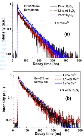 PL decay kinetics at RT recorded at 570 nm under blue light excitation (450 nm) in MPs sintered with different amounts of B2O3 flux (a) and different concentrations of Ce3+ ions (b).
