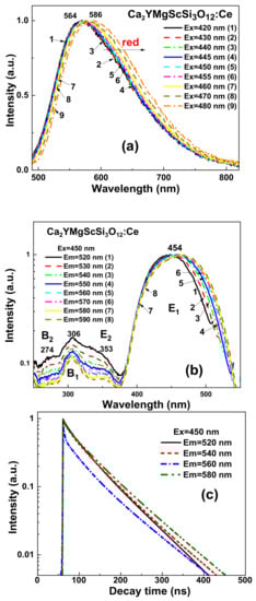 The normalized excitation spectra of the Ce3+ luminescence in the Ca2YMgScSi3O12:Ce MP samples are shown in Figure 7b. In these spectra, the most intensive excitation bands, E1 and E2, peaked in the 454 nm (E1) and 353 nm (E2) ranges, are attributed to the intrinsic transitions from the 4f(2F5/2) level of the ground state to the 5d (E2) excited level of the Ce3+ ions (Table 4). The excitation bands peaked at 306 nm (B1 band) and 274 nm (B2 band) are also observed in the excitation spectra of the Ca2YMgScSi3O12:Ce MPs (Figure 7a,b). These excitation bands are not related to the intrinsic transitions of the Ce3+ ions and probably correspond to the Ce3+ luminescence excitation by the emission of the defect centers or the emission of flux-related impurities [30,31].