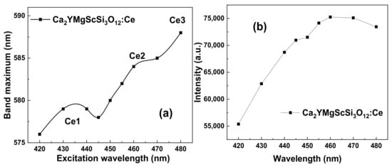 Dependencies of the maxima (a) and intensities (b) in the peak positions of Ce3+ emission bands on excitation wavelength in Ca2YMgScSi3O12:Ce MPs (see Figure 7a,b).