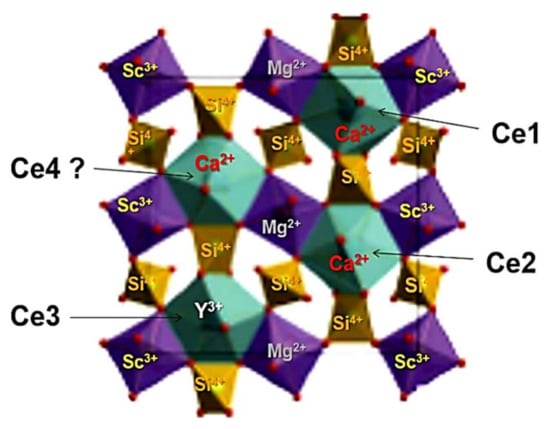 Behavior such as that shown in the decay curves of the Ca2YMgScSi3O12:Ce MPs can also indicate possible energy transfer from high-energy to low-energy Ce3+ emitting centers in these garnets [32,33]. The different decay times in the Ca3Sc2Si3O12:Ce SCF can correspond to the different Ce3+ centers in the dodecahedral positions of the garnet lattice with various local surroundings by oxygen and cations (Sc3+ and Si4+ ions in the octahedral and tetrahedral positions, respectively, and Ca2+ and Y3+ cations in the dodecahedral positions of the garnet host; Figure 9).