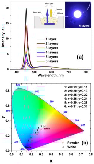 To demonstrate the application possibility of the development of CYMSSG:Ce phosphor, WLED prototypes were fabricated by coating a blue LED with an emission wavelength of 450 nm with several films containing CYMSSG:Ce phosphor embedded in epoxy resin (Figure 10a). PC measurements of the WLED prototypes were performed after each successive PC layer of a thickness of approximately 100–120 µm. The emission spectra of these WLEDs are quite broad and cover the entire visible range from 400 to 780 nm. The emission spectra of the WLED prototypes also show a significant decrease in the intensity of the blue component and a respective continuous increase in the intensity of the yellow emission by increasing the total film thickness (Figure 10a). As can be seen from Figure 10b, the color coordinates move to the diagram’s center by increasing the total thickness of the PC film. Finally, the WLED prototypes, based on six films of CYMSSG:Ce MP PC, give quite cold white emissions with the correlated color coordinates (CCC) x = 0.315; y = 0.31 and a correlated color temperature (CCT) of 6930 K. Furthermore, as the thickness of the photoconverter film increases, the color coordinates move to the center of the diagram, including the warm white color pattern. However, these trends of the photoconverting properties of the developed WLED prototypes are quite limited by the conversion efficiency of the CYMSSG:Ce MP phosphor with a Ce3+ concentration of 1 at.%. To obtain a precise tuning of the photoconversion properties (CCC and CCT), the CYMSSG:Ce MP phosphor with Ce3+ concentration above 1% can be used as well.